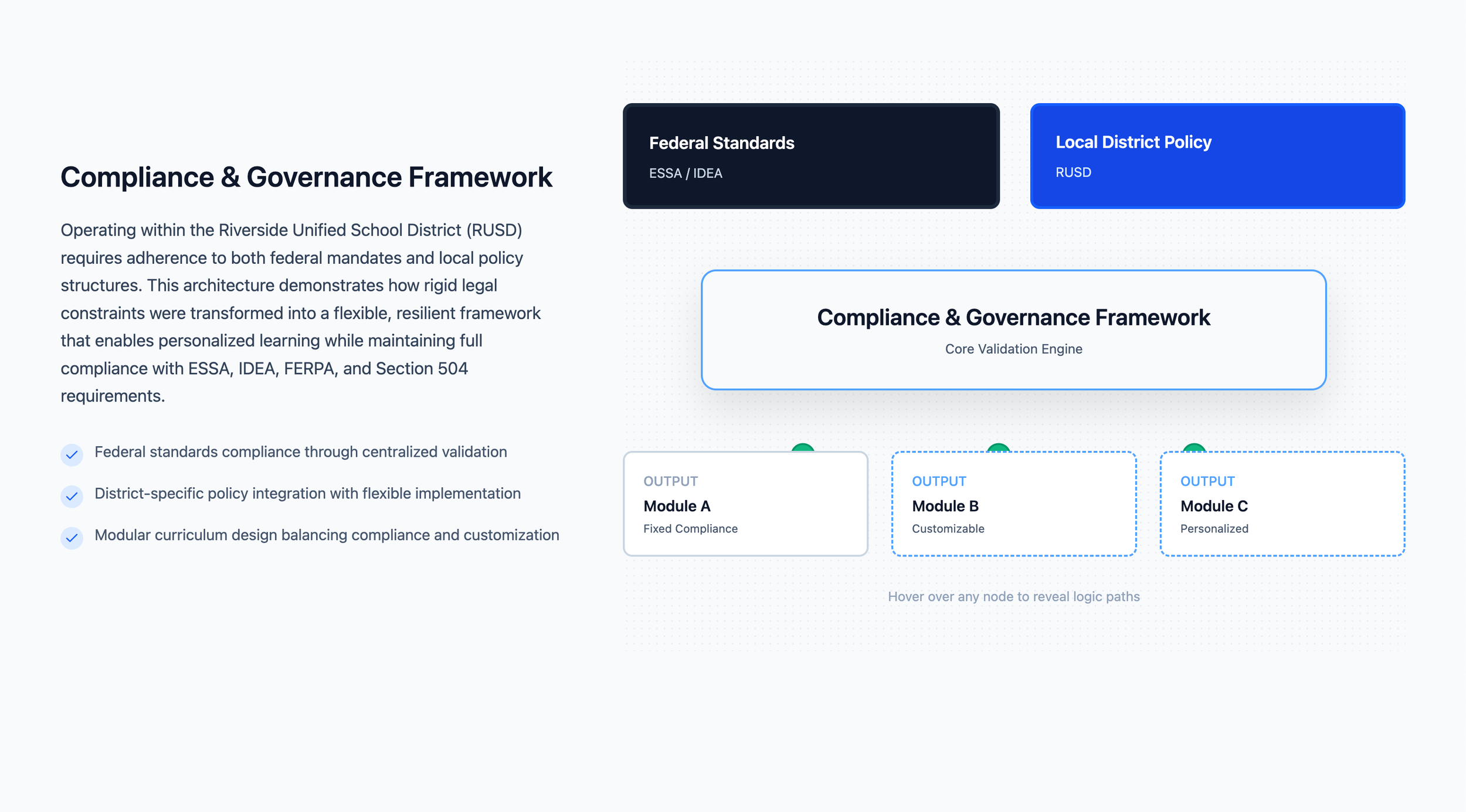 Operating within the Riverside Unified School District system required a deep mastery of Compliance and Policy Governance. I architected curriculum frameworks that met rigorous federal and local standards while remaining flexible enough for personalized implementation. This experience in 'Designing within Constraints' is a core pillar of my architectural philosophy—ensuring that every system I build is technically sound, legally compliant, and operationally resilient.