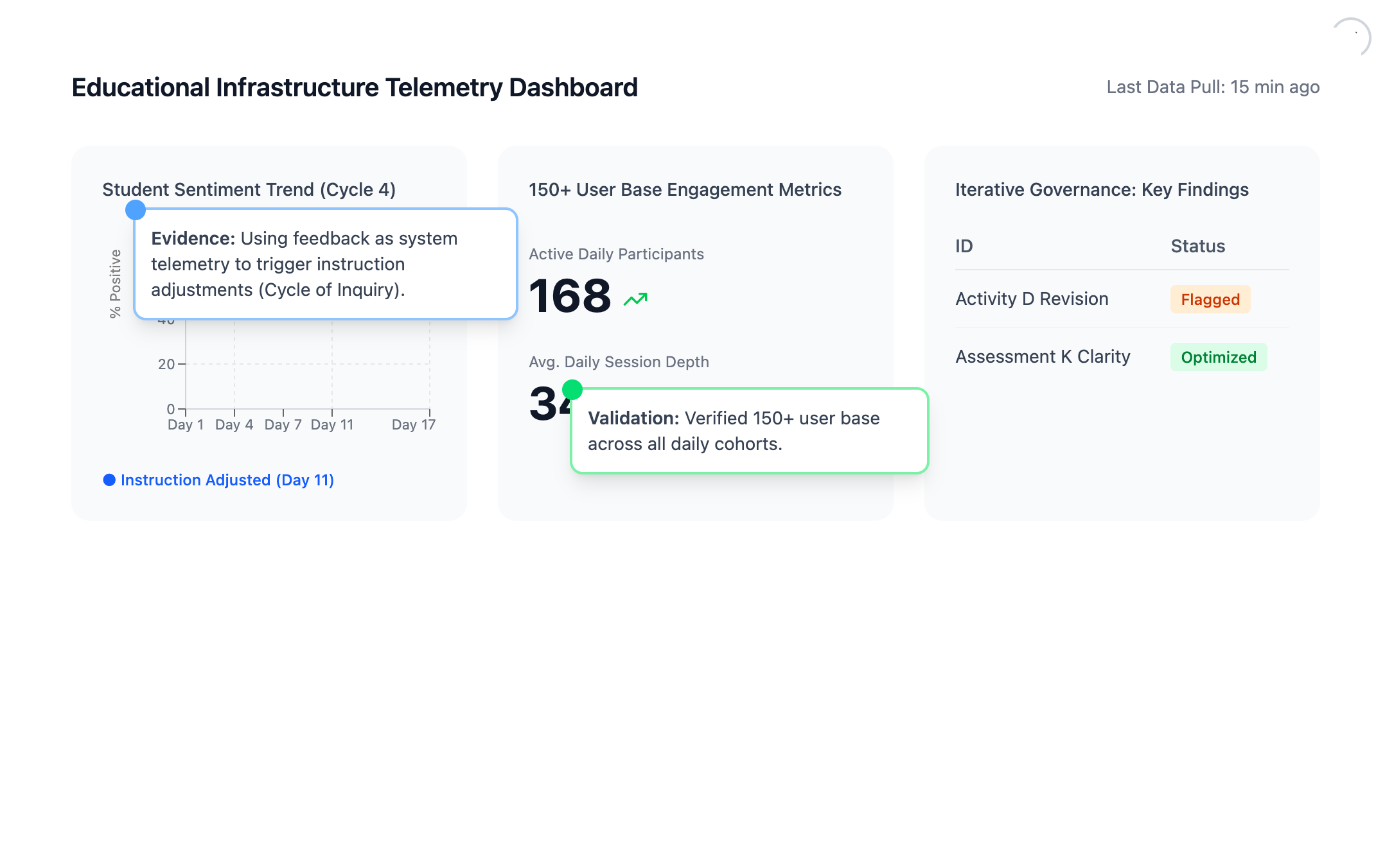 The classroom is a high-frequency testing ground for Iterative Governance. I utilized 'Cycle of Inquiry' frameworks to audit classroom performance in real-time, treating student feedback and assessment data as system telemetry. This allowed for rapid prototyping of instructional delivery methods, ensuring that the 'Educational Infrastructure' remained responsive to the shifting needs of a 150+ person user base across multiple daily sessions.