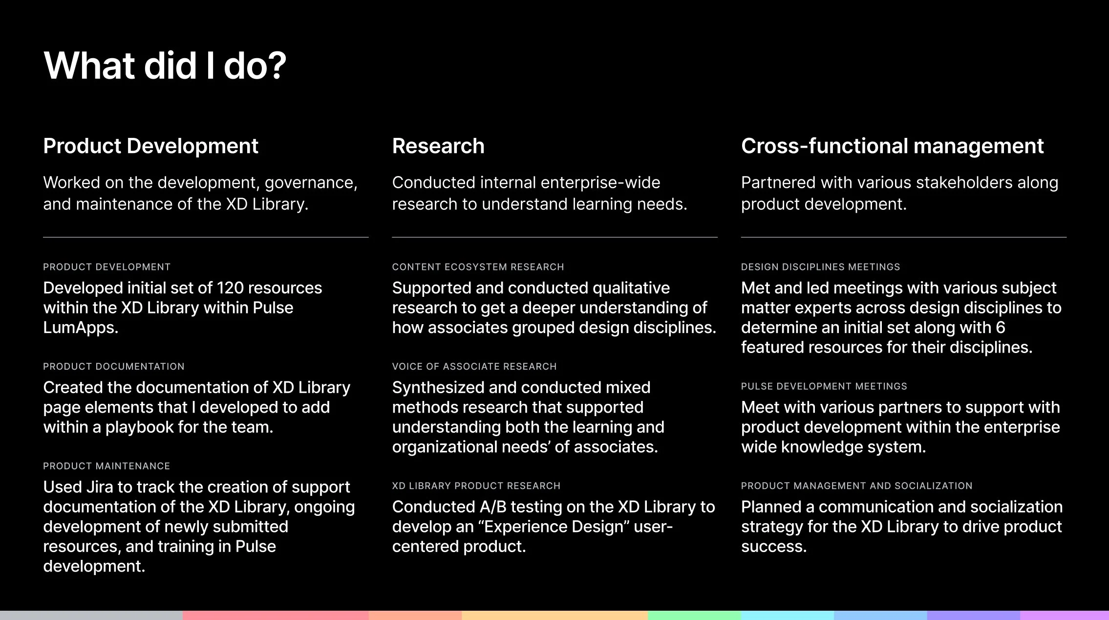 One of my first corporate projects was related to education. As an ex-teacher, I loved developing an internal learning management system for associates and working with stakeholders across the design enterprise. I was able to draw on many transferable job skills from my time in the classroom to work in a corporate environment and ship a product that has consistently hit key performance indicators.